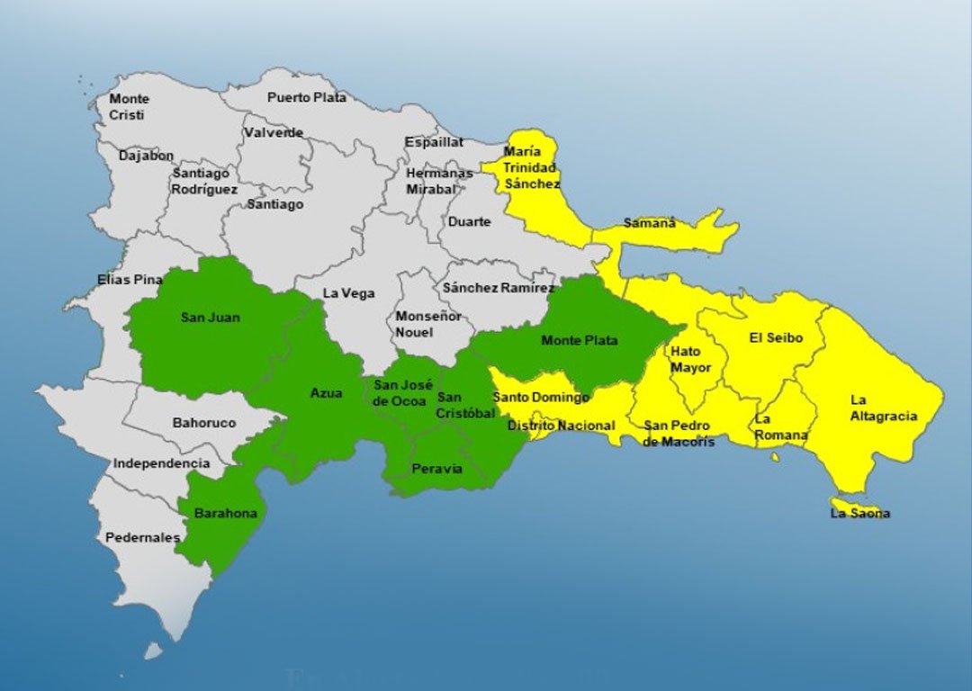 El Centro de Operaciones de Emergencias (COE) declaró este jueves alerta amarilla para ocho provincias y el Distrito Nacional, mientras mantiene alerta verde para otras siete, ante los efectos de una activa onda tropical combinada con una vaguada. Estas condiciones están generando un ambiente inestable y altamente húmedo en gran parte del país.