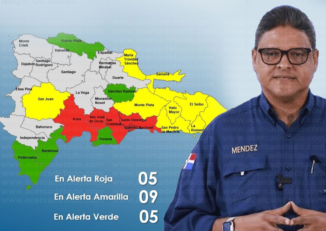 El Centro de Operaciones de Emergencias (COE) colocó este viernes a cuatro provincias y al Distrito Nacional en alerta roja, mientras mantiene nueve en amarilla y cinco en verde, debido a las condiciones meteorológicas asociadas a una activa onda tropical combinada con una vaguada en altura.