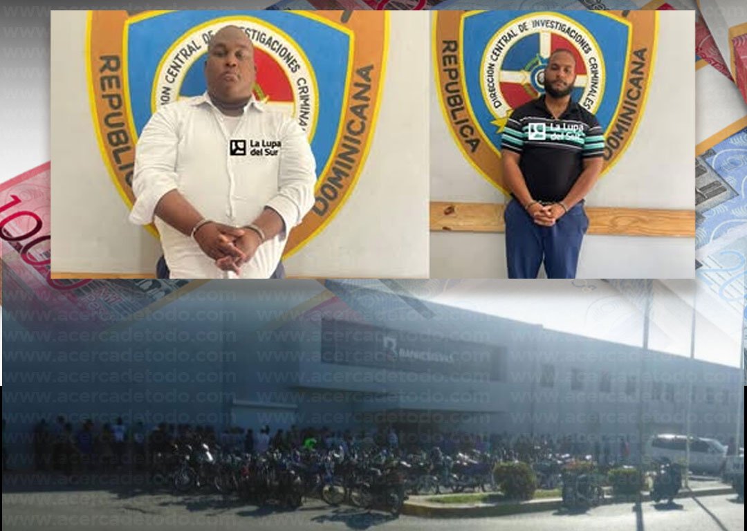 Los detenidos fueron identificados como Ángel Adriano Báez, de 26 años, y Deuris Misael Florián Matos, de 31, quienes laboraban en la sucursal ubicada en la calle José Francisco Peña Gómez.