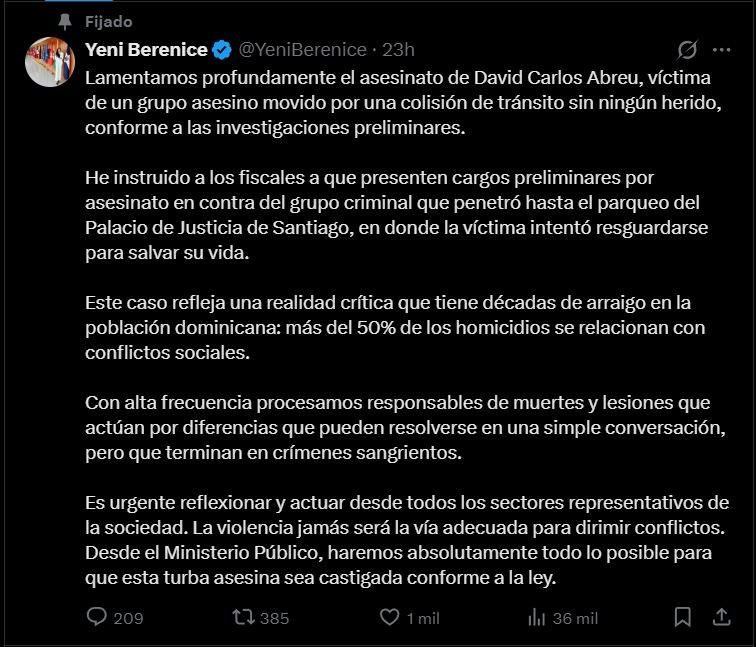 “Lamentamos profundamente el asesinato de David Carlos Abreu, víctima de un grupo asesino movido por una colisión de tránsito sin ningún herido, conforme a las investigaciones preliminares.